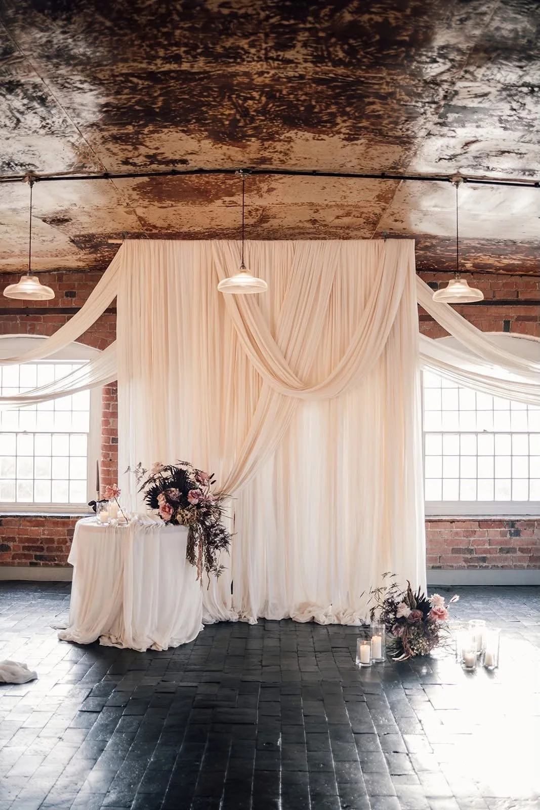 Consider the areas where your guests’ eyes will naturally be drawn. Ceremony backdrops, the top table, or a key focal point in the room create the most impact. By prioritising these areas — through beautiful draping, statement candles, or florals — you can transform the space far more effectively than by spreading your attention thinly across every corner.