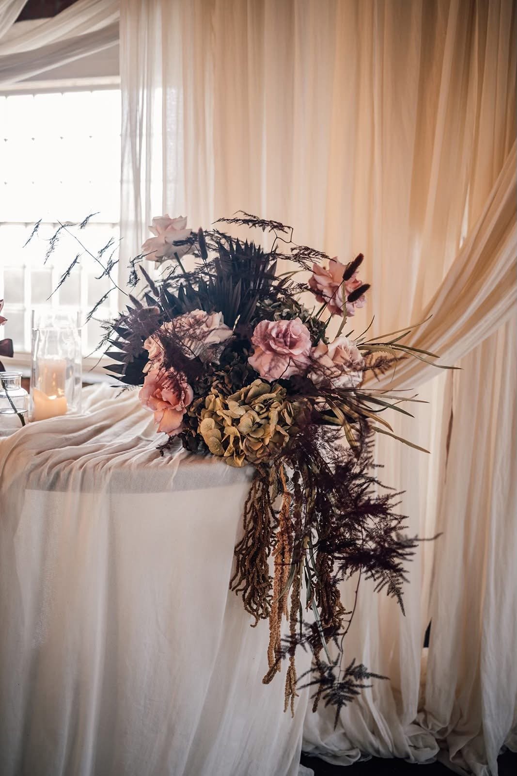 Draping is a transformative element in wedding styling. Soft fabrics can completely change the feel of a space, conceal less attractive features, and add movement and texture. Used behind the ceremony, framing a sweetheart table, or in subtle corners, fabric creates a luxurious, considered look. Choosing neutral or rich tones keeps the styling timeless and sophisticated.